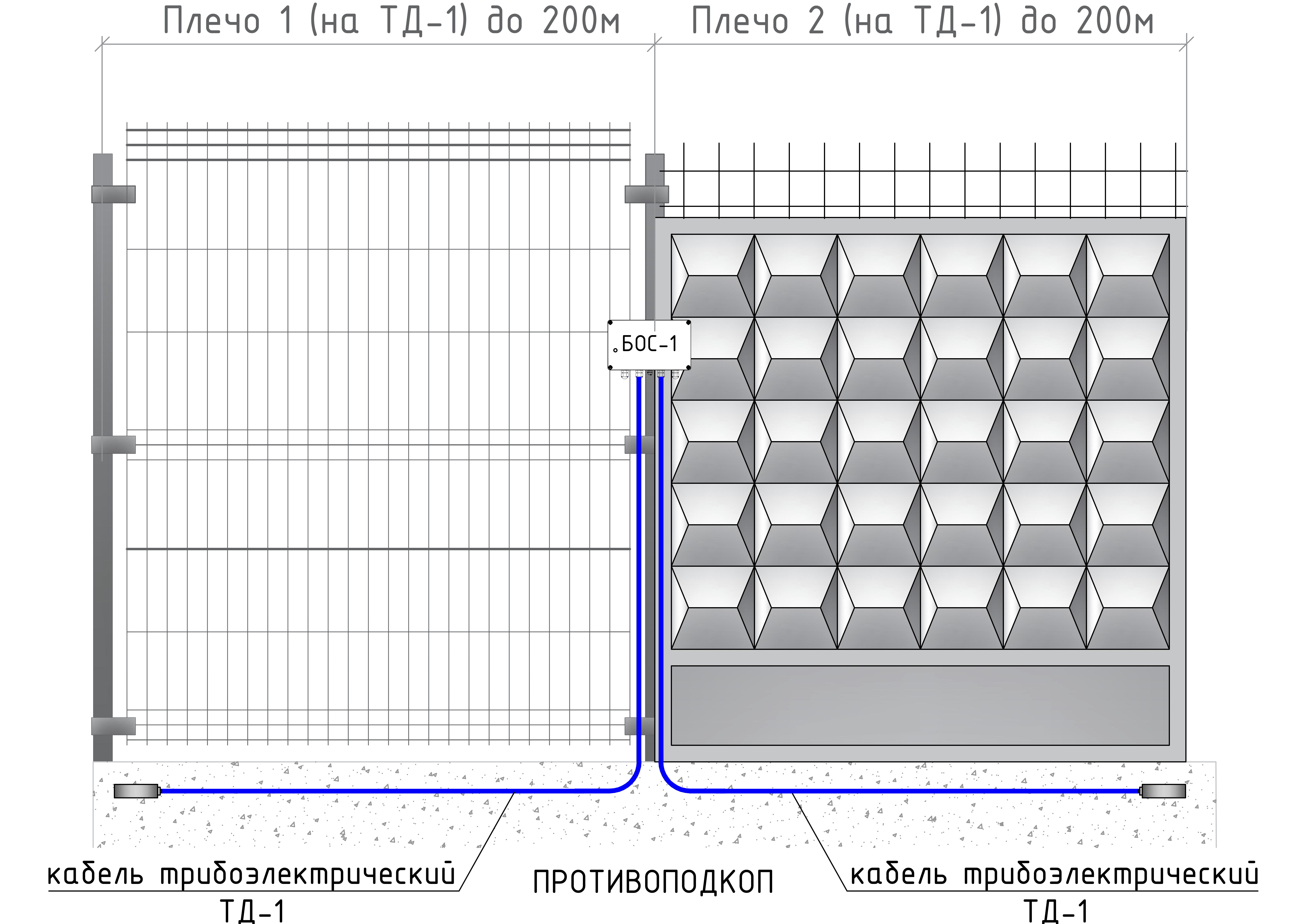 | Волоконно-оптический или трибоэлектрический противоподкоп (БОС-ВО, БОС-1) | Обнаружение подкопов и земляных работ рядом с ограждением |