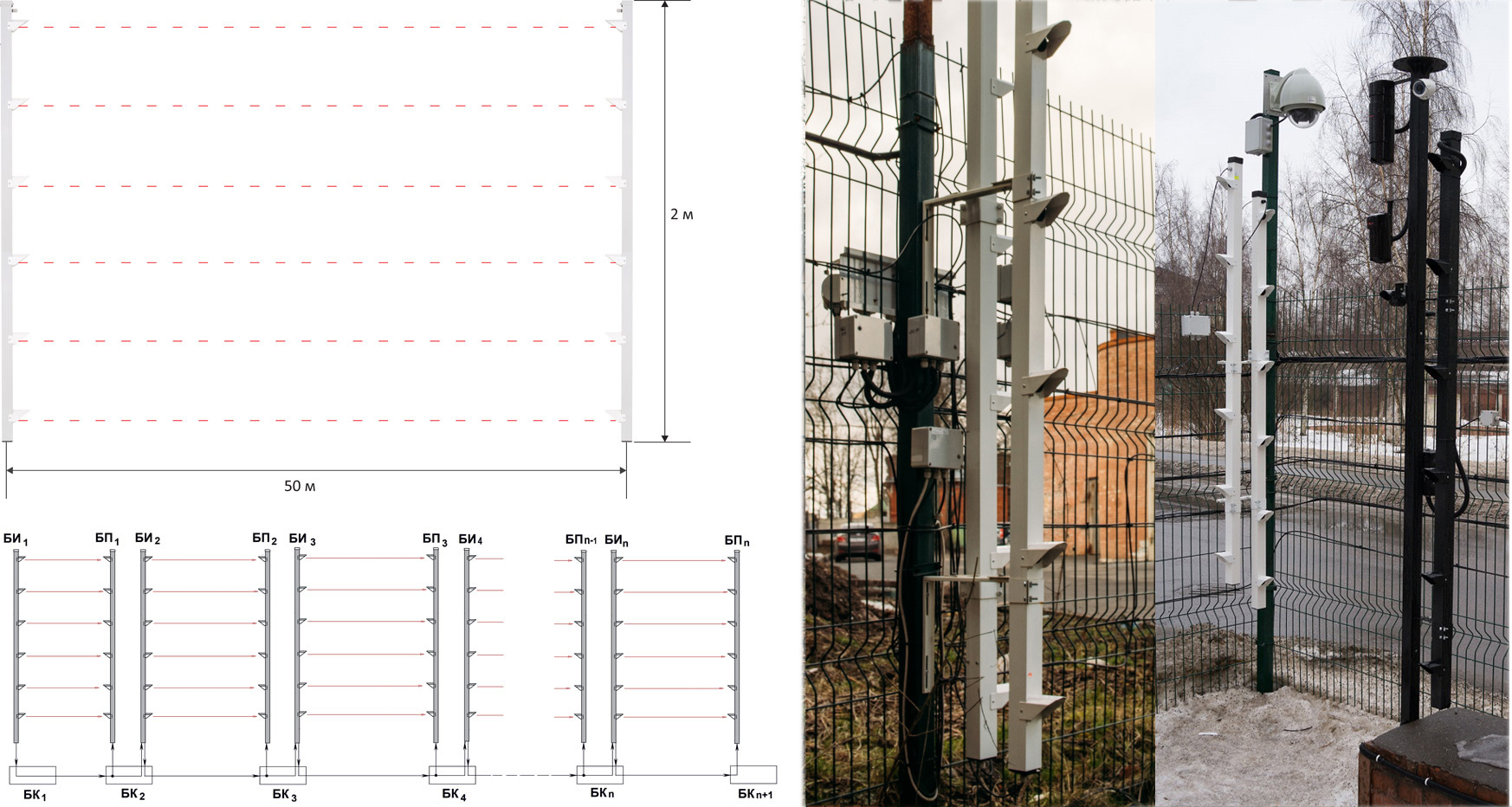 | Монолитное ограждение (бетон, кирпич). Нет второго уровня ограждения. Есть полоса отчуждения | Пассивные ИК датчики (ИД) + сейсмическая система (БОС-ВО, БОС-Ц) |